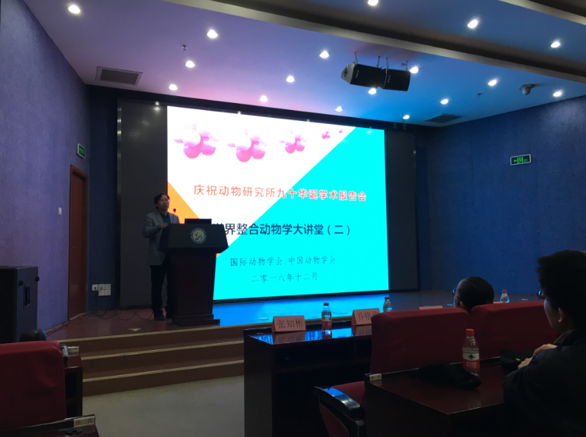 20181213日上午,世界整合动物学大讲堂(一)在中国科学院动物研究所举行。报告会由国际动物学会理事长张知彬研究员、中国动物学会副理事长兼秘书长王德华研究员主持,中国科学院动物研究所党委副书记、纪委书记杨俊成代表研究所致欢迎辞,欢迎各位老师和同学参加动物研究所九十周年所庆活动之一,感谢国际动物学会、中国动物学会联合组织了这项活动。