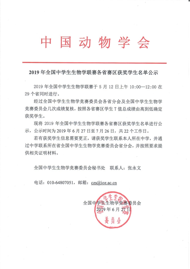 2019年全国中学生生物学联赛获奖学生名单公示